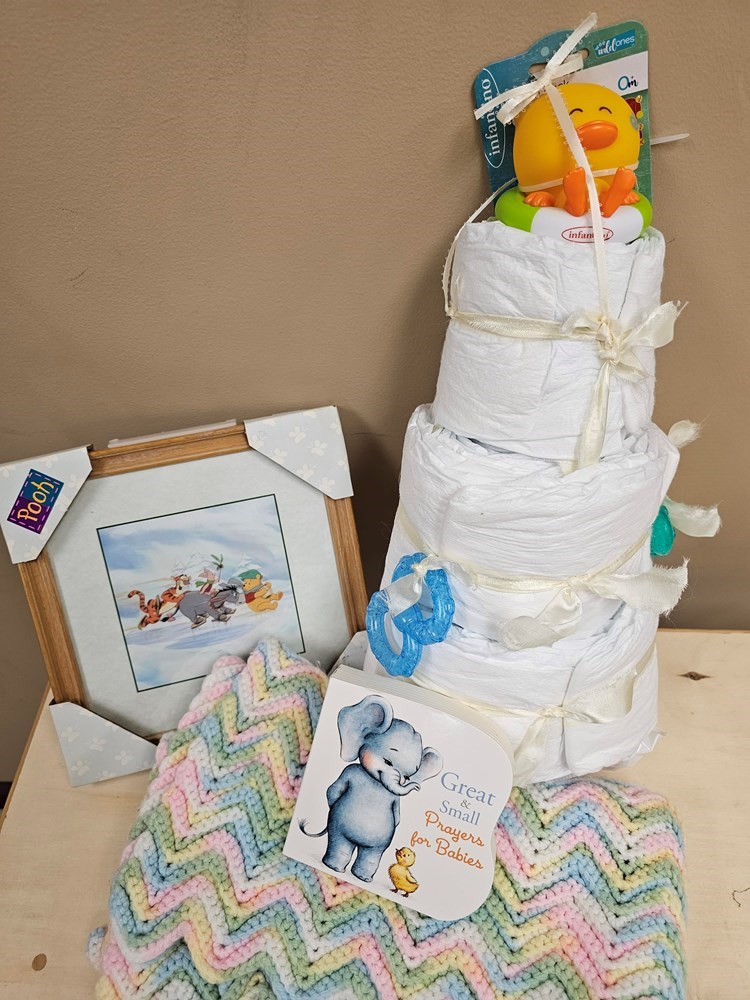 3 Teething Rings Bath Toy Baby Blanket 2 Books Diaper Tower Wet Wipes